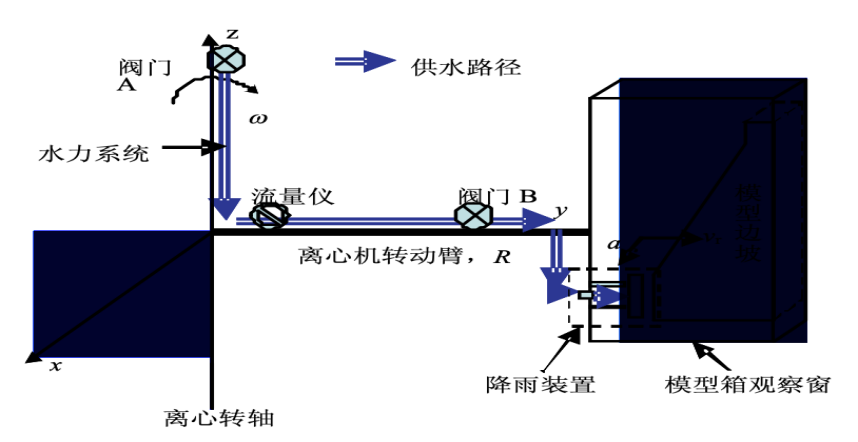 该系统能在离心加速度场环境和振动台动力吊篮内,与振动台共同实施降雨+地震多灾种耦合的模拟缩尺试验,并满足降雨、冻融等独立自然灾害模拟试验需求。利用水-气混合技术产生雾化程度高、粒径细小且均匀的水滴,这些细小水滴在气流的作用下,能够更好地模拟“飘洒”的效果,从而在模型表面实现相对均匀的降雨。解决了在强离心力场下,水滴会受到巨大的惯性力,难以像正常重力下那样“降落”,很容易被甩向模型容器外侧,导致降雨极度不均匀的问题。系统具有降雨流量、流速、雨滴、面积、时间等调节与控制功能,可完美地实现降雨+地震多灾种耦合作用下,边坡、泥石流、高土塌方、溃坝等自然灾害模拟实验研究。