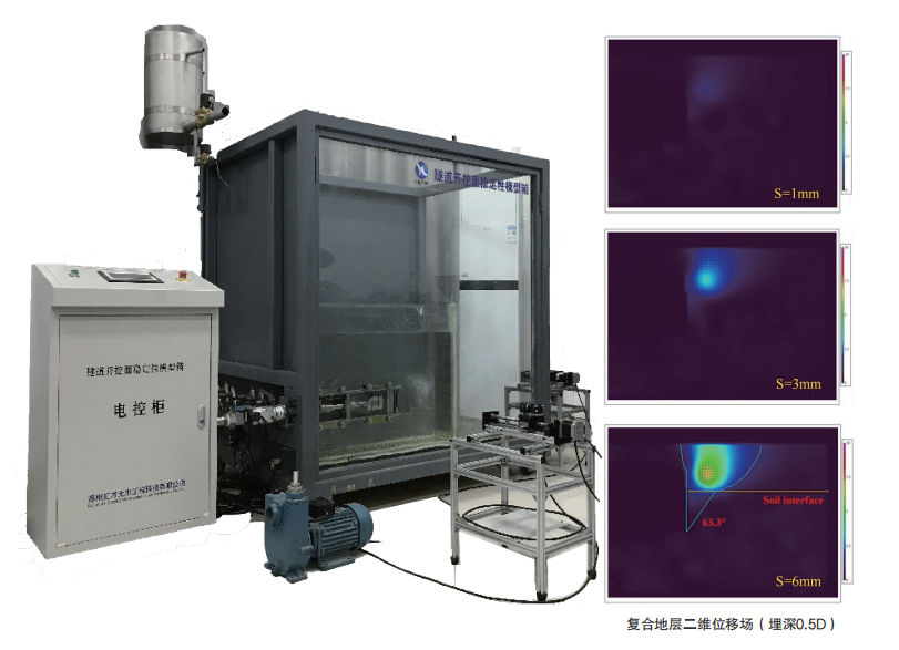 隧道开挖面模型测试系统以盾构隧道开挖面稳定性为研究目标,模型箱长*宽*高为1.5m*1m*1.5m,可通过试验动态模拟隧道开挖,研究开挖面失稳,可以测量得到隧道掌子面在不同土层组合及承压水条件下的地表位移、孔隙水压力以及土体变形等数据,据此可以研究隧道—土体—地下水的关系,试验中采用图像采集设备对地表沉降、孔隙水压力、模型槽内力分布及对称断面土体运动图像进行动态采集。以移动面板后退速率及位移为控制指标,研究不同工况下开挖面支护力、地层变形规律,并采用颗粒图像测速技术(PIV)分析不同支护板后退速率下开挖面失稳区域位移增量场、剪应变增量场。